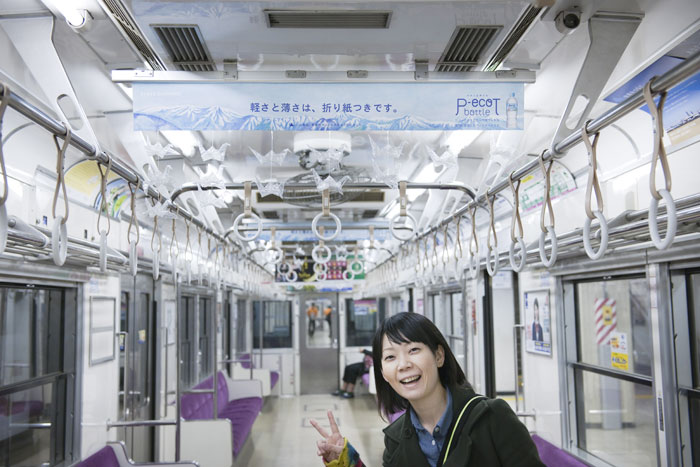 見えづらいかもしれないけど、ペットボトルで折り鶴を折りました。コピーは「軽さと薄さは、折り紙つきです。」愛おしいコピーです。