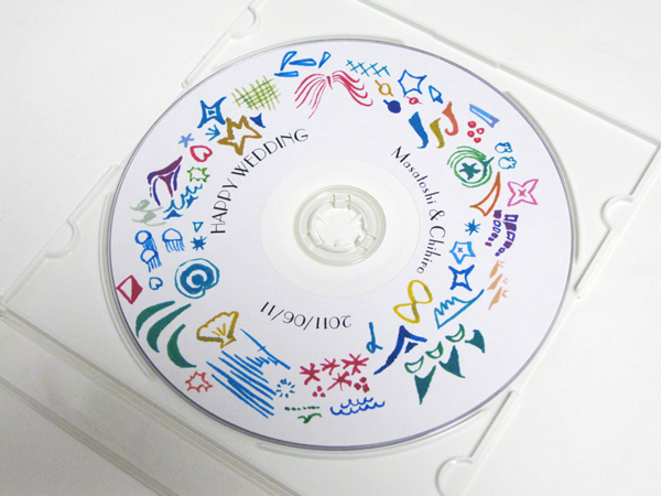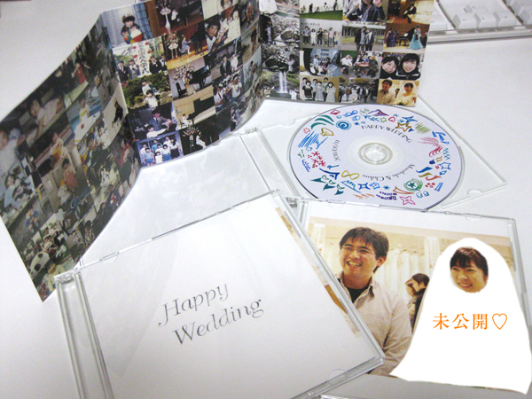 旦那様のご両親にもあげようと思って、中もちゃんと作りました!DVDの盤面に大学の時に書いてた絵を組み合わせて、なんとなくお祝いっぽく。特に意味はありません。中には見開きで幼少期から最近までの写真も載せました。今日会社で作りました。 こらっ!